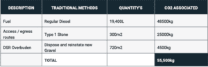 55,500kg traditional methods reduced to 1332kg C02 using Carbon saving methods resulting in a massive 54,168kg (54Tons) of C02 saved.