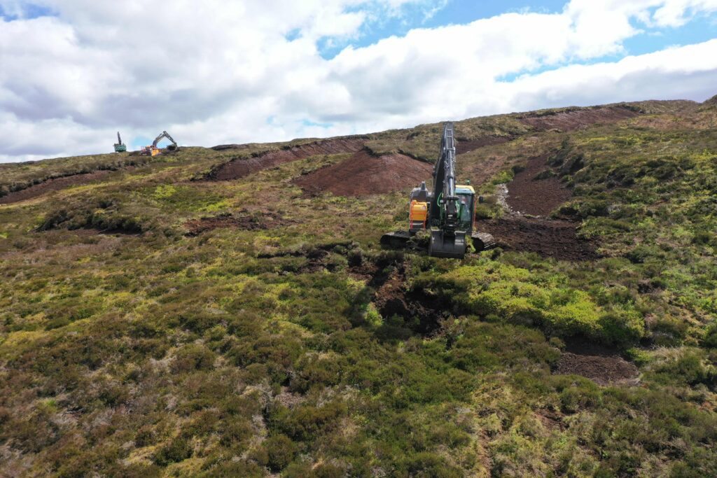 A number of techniques are being used on-site including peat hag reprofiling. This involves an excavator being used to peel back surface vegetation, re-profile the exposed peat to a more gradual angle and then replace the vegetation from the top back over the newly re-profiled slope.