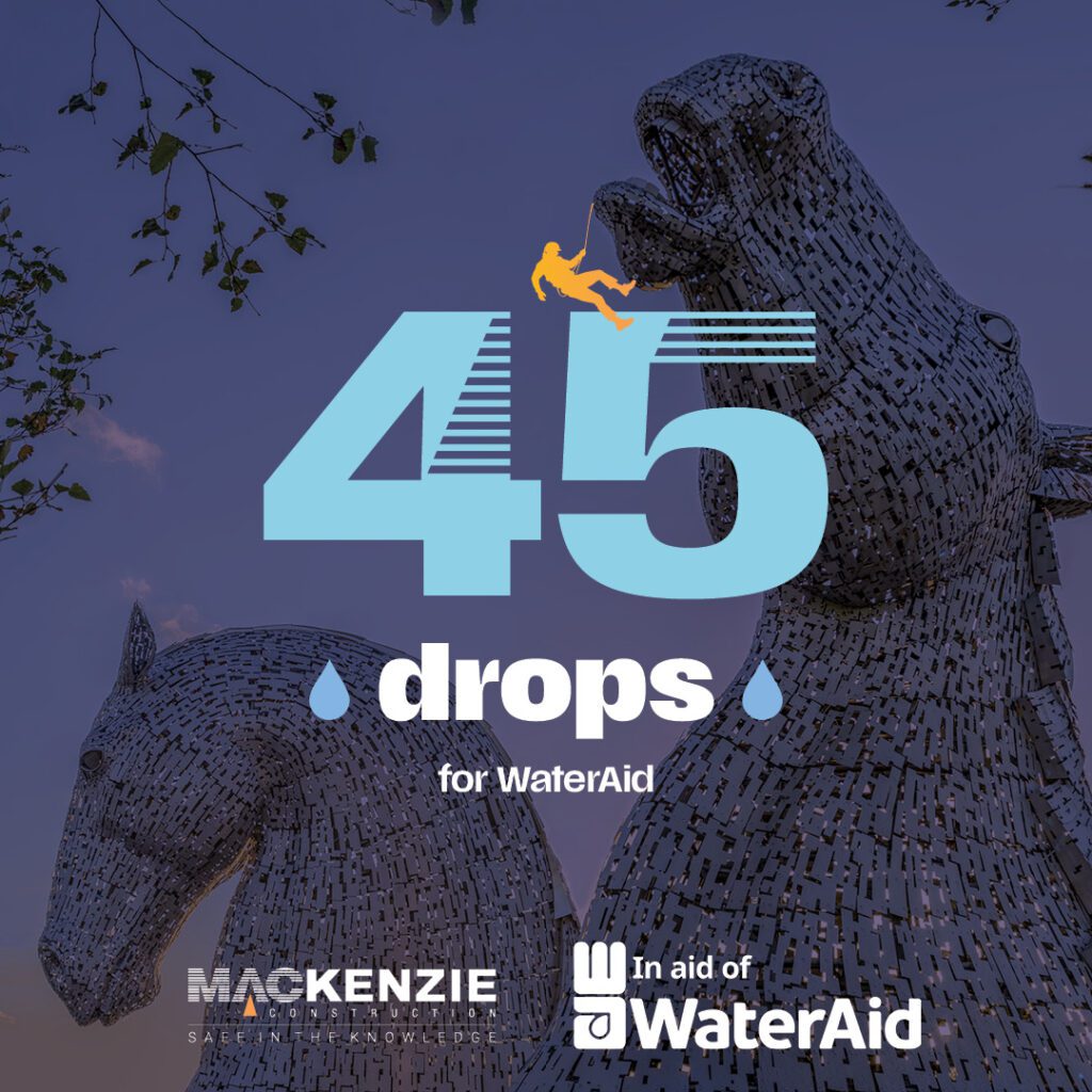 In celebration of our 45th anniversary, we are excited to announce the launch of our celebratory Charity Partner Event, ‘45 Drops for WaterAid’. On November 19th, our date of inception, 45 courageous participants will ascend inside the iconic Kelpies and abseil 100 feet back down, to raise vital funds for WaterAid to support clean water and sanitation projects around the globe.